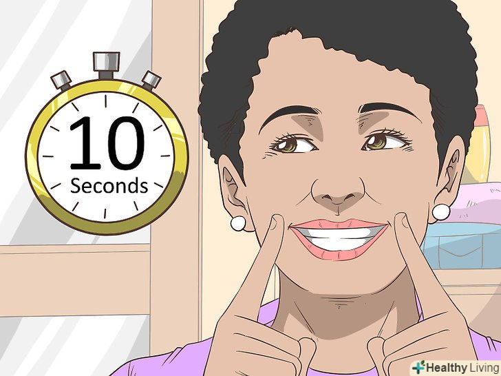 Тренуйтеся посміхатися.як і будь-яка частина тіла, мімічні м'язи розвиваються завдяки регулярним тренуванням. Їх можна зміцнювати і тримати в тонусі, завдяки чому посмішка дається легше. Виконуйте вправи для м'язів обличчя і посміхайтеся, щоб виглядати більш здоровим і молодим.[4]- Одним з базових вправ є проста посмішка. Потягніть куточки рота в сторони і утримуйте в такому положенні 10 секунд. Після цього злегка розімкніть губи і утримуйте в такому положенні ще 10 секунд. При повторному виконанні можна посміхнутися трохи ширше.[5]