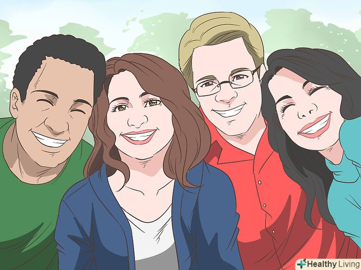 Спілкуйтеся зі щасливими людьми.як і у випадку з власними мімічними м'язами, спостереження за посмішками інших людей підвищують нашу схильність до посмішки. Причини досі не ясні, але посмішка абсолютно точно "заразлива". Побачивши усміхненого людини, ми самі мимоволі починаємо посміхатися.[14]- Для поліпшення настрою проводите час з веселими і радісними друзями і рідними. У вас кумедна тітка? Частіше спілкуйтеся з нею, щоб вона могла ділитися своїм настроєм.