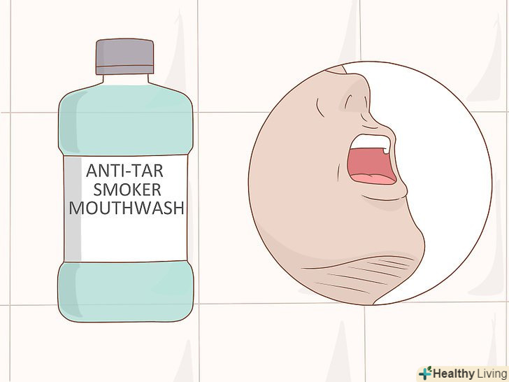 Користуйтеся ополіскувачем для рота, який призначений спеціально для курців.у продажу можна знайти спеціальні рідини для полоскання рота, які призначені для зниження кількості смоли та інших хімічних речовин у роті після куріння. Ними необхідно користуватися після кожної викуреної сигарети.[8]- Звичайні ополіскувачі для рота не збережуть ваші зуби білими, але вони поліпшать загальний стан порожнини рота. Користуйтеся звичайною рідиною для полоскання рота навіть в тому випадку, якщо ви ніде не знайдете спеціальний ополіскувач від смоли. Головне, виберіть лікувальний засіб, який бореться з гінгівітом і одночасно освіжає подих (замість звичайного ополіскувача, яке просто освіжає подих). Їх не важко відрізнити, так як до складу лікувальних ополіскувачів для рота входять фториди і антимікробні речовини.[9]