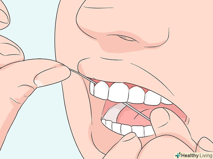 Кожен день чистіть зуби зубною ниткою.зубний камінь може утворитися між зубами, якщо не видаляти частинки їжі, які там залишаються.[3]- Під час чищення обережно проводите зубною ниткою між кожним зубом. Почистіть зубною ниткою між усіма зубами, щоб прибрати скупчилися частинки їжі. Потім потягніть за нитку, щоб витягнути її.