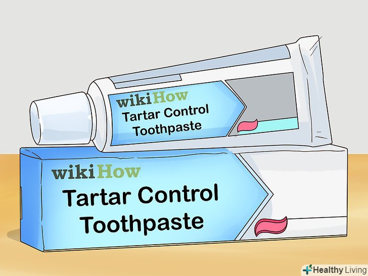 Чистіть зуби пастою проти зубного каменю.серед безлічі паст, які можна знайти в магазині, знайдіть ту, на якій є позначка «запобігає утворенню зубного каменю». До складу цих паст входить легке абразивне речовина, яке видаляє наліт з поверхні зубів.[7]- Якщо у вас чутливі зуби, купіть пасту, на якій написано «запобігає утворенню зубного каменю» і «для чутливих зубів».