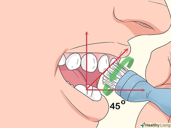 Чистіть зуби короткими рухами, тримаючи зубну щітку під кутом 45 градусів.щоб прибрати наліт нижче лінії ясен, тримайте зубну щітку під правильним кутом. Якщо ви будете тримати зубну щітку під кутом 45 градусів, деякі щетинки зможуть дістати до верхньої частини ясен.[8]- Чистіть зуби короткими плавними круговими рухами. Така чистка дозволить найбільш ефективно видалити наліт і частинки їжі.