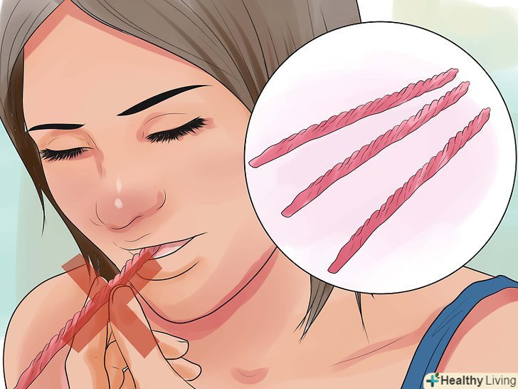 Уникайте будь-якої тягучої або вимагає тривалого жування їжі.такі продукти можуть пристати до брекетів, і їх буде важко видалити.[7] в процесі жування таких продуктів брекети можуть зміщуватися зі свого положення на зубах. В цьому випадку доведеться записуватися на прийом до ортодонта, щоб зафіксувати брекети повторно, і в результаті лікування може затягнутися.- Уникайте ірисок, батончиків з карамеллю, твердого желе і желейних цукерок, мармеладу-горошку, лакричних цукерок і таких цукерок як "Скітлс", "Ментос" і "Старберст". Арахісове масло їсти можна.