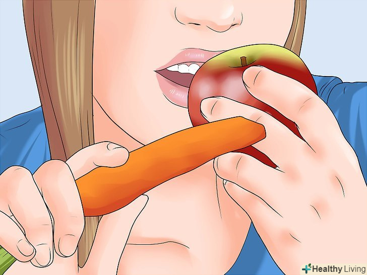 Їжте хрусткі фрукти та овочі.ви можете ефективно очистити наліт, навіть не використовуючи зубну щітку. Для цього достатньо лише поїсти хрусткі овочі або фрукти, наприклад, морква, яблука і груші. Такі фрукти і овочі м'яко видаляють зубний наліт, а також стимулюють вироблення слини, яка зменшує вплив бактерій, які є причиною утворення зубного нальоту.[23] якщо вам хочеться почистити зуби від нальоту, але під рукою у вас немає зубної щітки, можете просто з'їсти яблуко, і ви отримаєте моментальний результат.