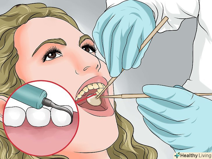 Відвідуйте стоматолога один раз в 6 місяців.звичайно, коли справа стосується гігієни порожнини рота, практично все в ваших руках. Незалежно від того, як ретельно ви доглядаєте за зубами, наприклад, використовуючи зубну нитку і засіб для полоскання рота, а також два рази в день очищаючи їх за допомогою зубної щітки, швидше за все, ви пропускаєте деякі ділянки, на яких з часом утворюється зубний камінь. В цьому випадку вам не обійтися без допомоги стоматолога.[30]- Крім того, стоматолог також зможе визначити, чи є у вас які-небудь інші проблеми з зубами і яснами, які можуть мати негативні наслідки.