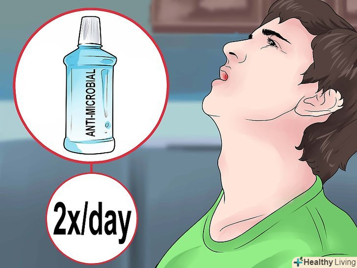 Користуйтеся ополіскувачем для порожнини рота, який має протимікробну дію.подібні ополіскувачі призначені для видалення нальоту, який утворюється в порожнині рота. Вони допомагають видаляти бактерії навіть в тих місцях, куди не вдається дістатися зубною щіткою і зубною ниткою. Ополіскувачі для порожнини рота є більш ефективним засобом для профілактики утворення зубного каменю в порівнянні із зубною ниткою.[12] діюча речовина ополіскувача-хлоргексидин, ефірні масла, дельмопінол або цетилпіридинійхлорид — не так важливо, головне, щоб на обраному вами ополіскувачі була позначка, що він має антибактеріальну дію.[13]- Однак не використовуйте ополіскувач для порожнини рота з хлоргексидином більше двох тижнів. Тривале використання подібного ополіскувача може привести до появи коричневих плям на зубах, які ви зможете видалити тільки в стоматологічному кабінеті.