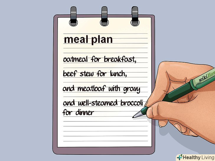 Складіть план харчування.цей план допоможе вам дотримуватися зміненої або обмеженої дієти. З його допомогою ви зможете планувати як свій щоденний раціон, так і харчування в більш довгостроковій перспективі.- Складіть список необхідних продуктів на тиждень. Ймовірно, вам доведеться проявити фантазію і подумати над різними рецептами, особливо якщо ви плануєте дотримуватися обмежену дієту протягом тривалого періоду часу.
