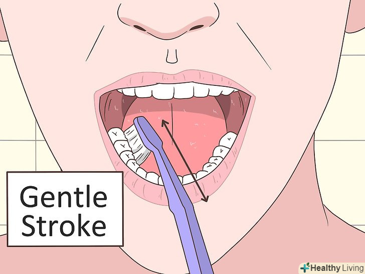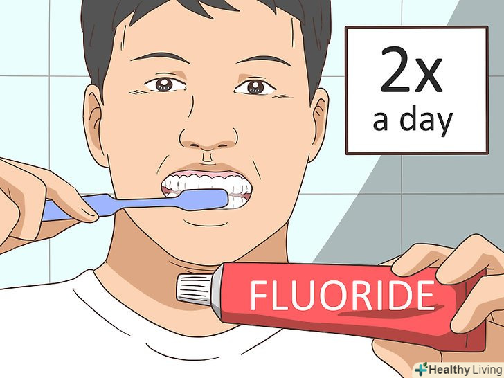 Чистіть зуби двічі на день.виділяйте час на те, щоб ретельно чистити зуби два рази в день. Вранці-після того, як прокинулися, а також ввечері — перед тим, як лягати спати. Користуйтеся зубною пастою, що містить фтор, а також зубною щіткою середньої жорсткості (або м'якою). Не варто використовувати жорстку зубну щітку.[3]- Подумайте про те, щоб купити електричну зубну щітку, яка більш ефективно прибирає зубний наліт в порівнянні зі звичайною мануальною зубною щіткою.