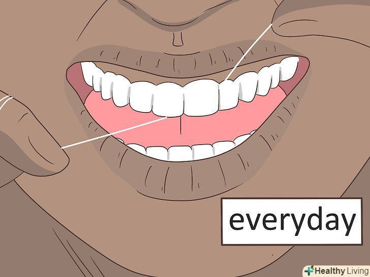 Кожен день користуйтеся зубною ниткою. використання зубної нитки має йти рука об руку з чищенням зубів.[7] Зубна нитка добре видаляє зубний наліт в тих місцях, куди не дістають щетинки зубної щітки.- Для більш ефективного використання зубної нитки потрібно відірвати шматочок цієї нитки довжиною з передпліччя (від зап'ястя до ліктя) і обидва кінці нитки намотати на середні пальці рук. Залиште вільним шматочок нитки довжиною близько 3 см, з яким ви зможете працювати.
