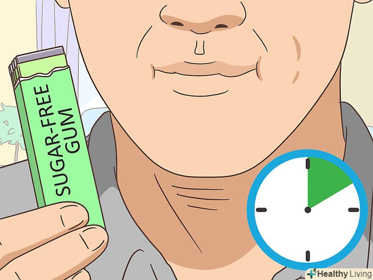 Жуйте жувальну гумку без цукру.відразу після процедури відбілювання, відкрийте пачку жувальної гумки без цукру. Почніть жувати одну подушечку, а через десять хвилин виплюньте її і почніть жувати нову. Робіть так до тих пір, поки не стиснете всю упаковку. Вважається, що це знижує чутливість зубів після відбілювання.[12]