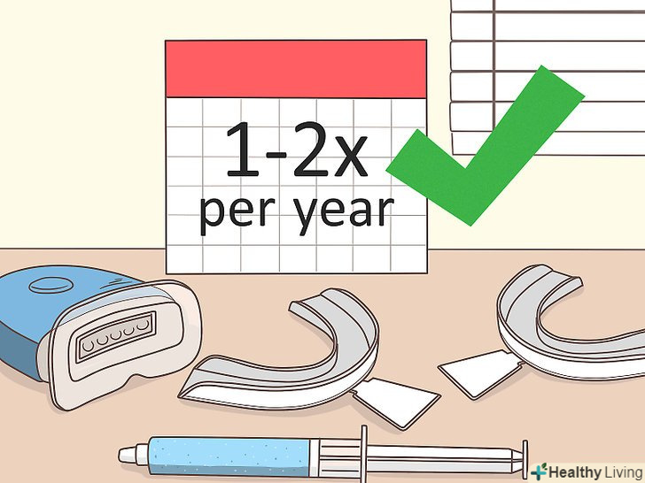 Дайте зубам відпочити між процедурами відбілювання.вважається нормальним вибілювати зуби за допомогою наборів з капами в домашніх умовах або у стоматолога один раз на рік. Більш часте відбілювання може негативно позначитися на здоров'ї зубів і зробити їх більш чутливими. Пам'ятайте, що відбілювання зубів – це серйозна процедура, а не елемент щоденного догляду за зубами.[13]- Якщо Ви користуєтеся отбеливающими зубними пастами або смужками, то користуйтеся ними хоча б через день, а краще рідше. Це дасть вашим зубам час відновитися між процедурами відбілювання.