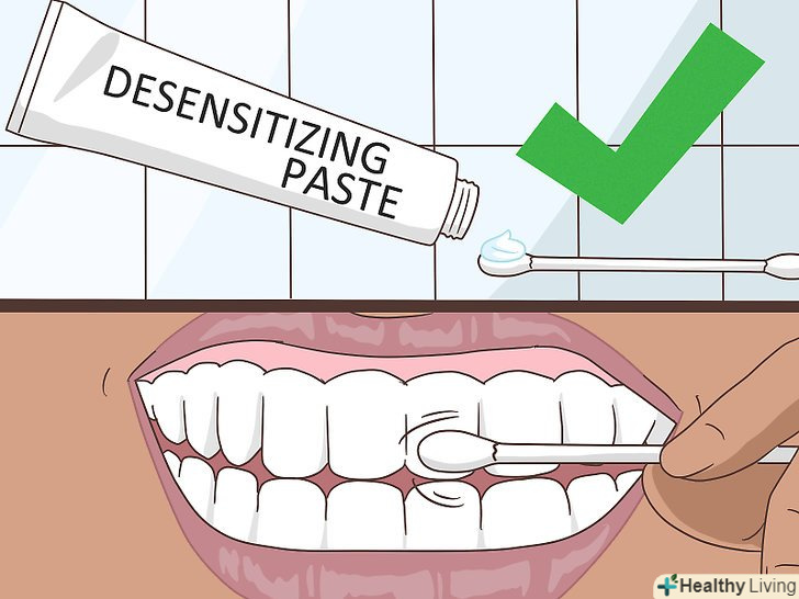 Нанесіть десенсибілізуючий гель, рідину або пасту.візьміть чисту ватяну паличку, нанесіть на неї деяку кількість засобу, а потім втирайте його в поверхню зубів. Залиште засіб на деякий час, як рекомендується в інструкції, а потім прополощіть рот чистою водою.[3]- Найчастіше подібні засоби містять нітрат калію, який викликає оніміння нервів в зубах, знижуючи таким чином їх чутливість. Найбільш популярними такими засобами є AcquaSeal і Ultra EZ, і придбати їх можна в більшості аптек. Ці кошти можна використовувати як до, так і після відбілювання.