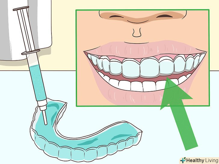 Заповніть спеціальні капи десенсибілізуючим засобом.приблизно за 30 хвилин до процедури відбілювання заповніть спеціальні капи гелем, який зменшує чутливість зубів, і покладіть їх на зуби. Коли ви будете готові до відбілювання зубів, просто приберіть капи, прополощіть їх і заповніть відбілюючим засобом. Також не забудьте прополоскати рот, щоб видалити залишки десерсибилизирующего кошти.- Перевірте, щоб капи з відбілюючим гелем були встановлені правильно-вони повинні сидіти тільки на зубах і не торкатися ясен. Якщо засіб потрапить на ясна, то стане причиною ще більшої чутливості.