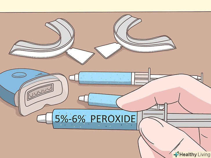 Використовуйте спеціальний набір для домашнього відбілювання зубів.більшість домашніх відбілювачів в якості основного компонента містять перекис водню. Перекис водню ефективна, але вона дратує нервові закінчення зубів, і таким чином робить їх чутливими. Вибирайте набір, що містить малу кількість перекису водню, приблизно 5-6%. Більш високі дози перекису не гарантують ефективність, але можуть стати причиною хворобливих відчуттів.[5]- Засоби для відбілювання зубів в домашніх умовах можуть бути самих різних форм: у формі смужок, капи з гелем, зубної пасти, лаку або фарби і навіть жувальної гумки. Якщо ви не знаєте, який з продуктів вибрати, то запитайте у свого стоматолога.
