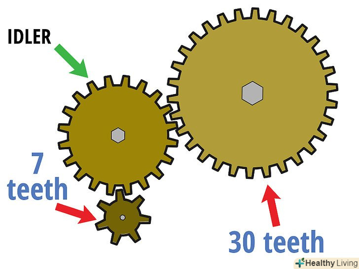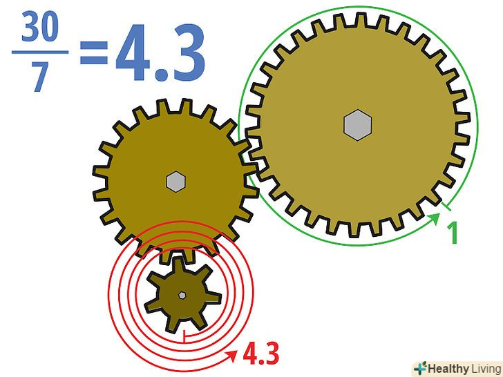 Розділіть кількість зубів веденої шестерні на кількість зубів ведучої шестерні.Пам'ятайте, що при визначенні передавального відношення зубчастої передачі з декількома шестернями важливо знати тільки кількість зубів веденої шестерні і кількість зубів провідної шестерні, тобто проміжні шестерні на Значення передавального відношення не впливають.- У нашому прикладі: 30/7 = 4,3. Це означає, що провідна шестерня повинна зробити 4,3 обороту, щоб ведена (велика) шестерня зробила один оборот.