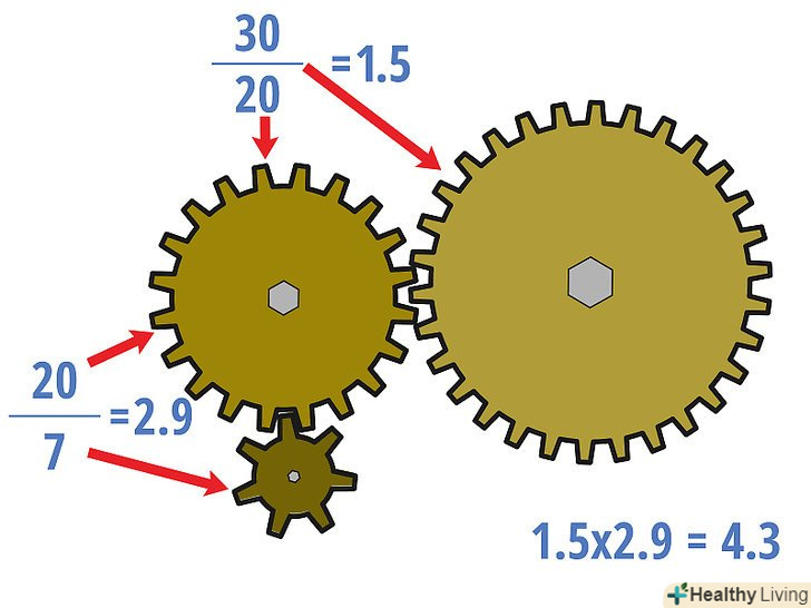 Якщо необхідно, знайдіть передавальні відносини для проміжних шестерень.для цього почніть з провідної шестерні і рухайтеся в напрямку веденої шестерні. При кожному новому обчисленні передавального відношення для проміжних шестерень розглядайте попередню шестерню в якості ведучої (і ділите кількість зубів веденої шестерні на кількість зубів провідної шестерні).- У нашому прикладі передавальні відносини для проміжної шестерні: 20/7 = 2,9 і 30/20 = 1,5. Зауважте, що передавальні відносини для проміжної шестерні відрізняються від передавального відношення всієї зубчастої передачі (4,3).