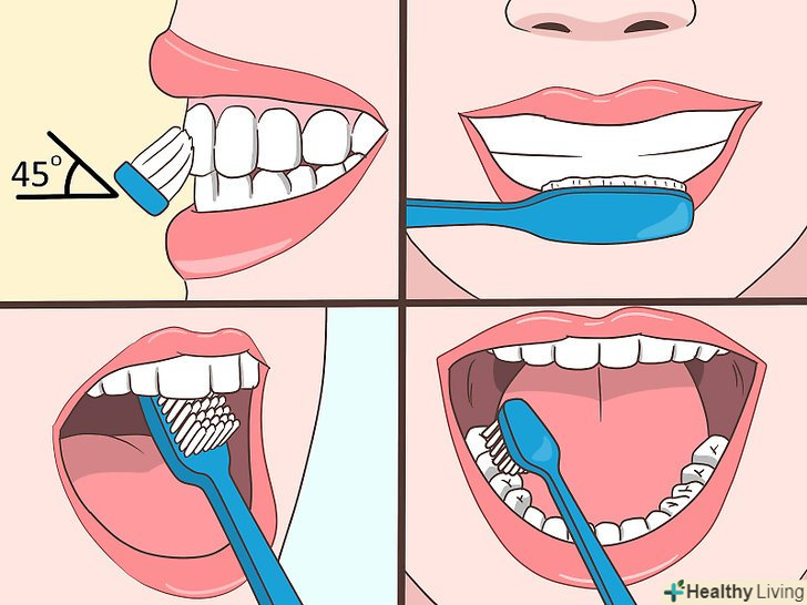Чистіть передню, задню, а також жувальну поверхню зубів.не забувайте чистити кожну сторону зубів, щоб прибирати весь наліт. Якщо ви чистите зуби звичайною зубною щіткою, тримайте її під кутом в 45 градусів у напрямку до ясен. Якщо ви використовуєте електричну зубну щітку, тоді ознайомтеся з інструкцією виробника і дотримуйтесь її.[3]- Користуйтеся зубною щіткою, яка схвалена стоматологічною Асоціацією Росії, оскільки вони проходять ряд тестів з безпеки і якості.[4]