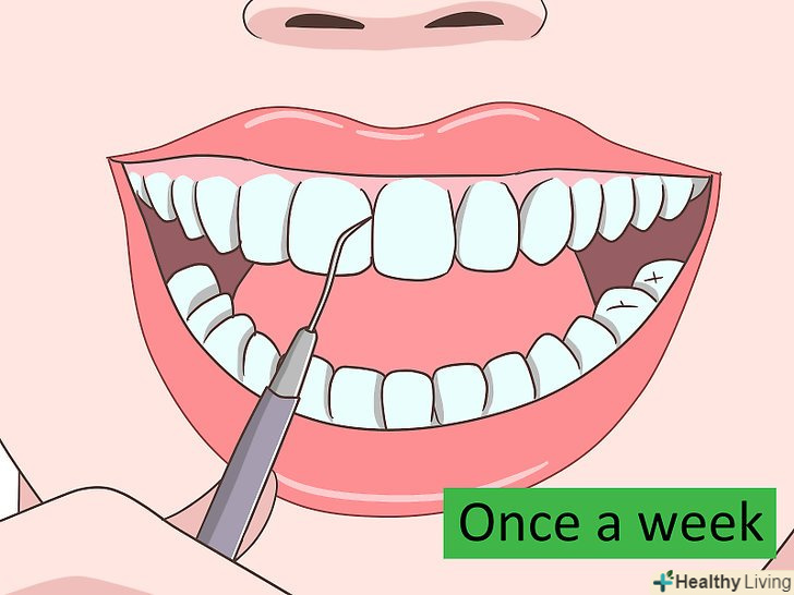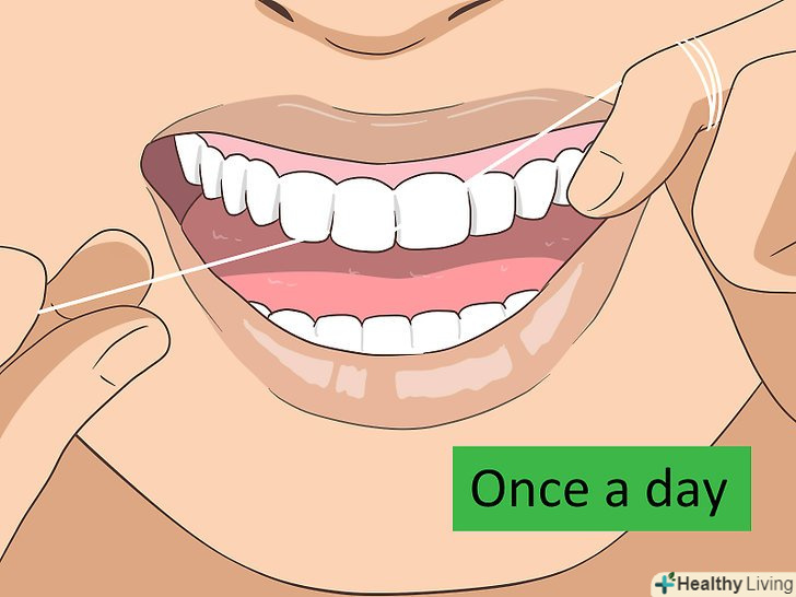 Раз в день чистіть зуби зубною ниткою.наліт може накопичуватися між зубів, де його важко прибрати однією лише зубною щіткою. Використовуйте звичайну зубну нитку або зубочистки з ниткою «Флосстік» для видалення частинок їжі і нальоту, щоб зубний камінь не утворювався між зубів.[8]