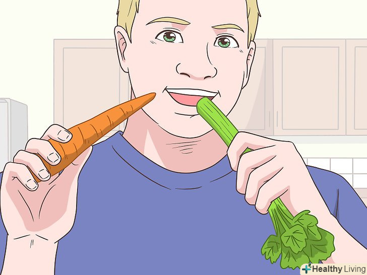 Їжте більше сирих овочів.процес жування твердого, волокнистого матеріалу в сирих овочах дозволяє очистити зуби. Під час перекусів замінюйте солодке на такі овочі, як морква, селера і брокколі.[11]- Бактерії, через які утворюється наліт, «люблять» продукти з крохмалем і цукром. Чим більше ви будете їсти таких продуктів, тим більше бактерій буде жити у вас в роті. Їжте ці продукти помірно і не забувайте полоскати рот водою або засобом для полоскання після їх вживання.[12]