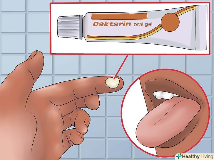 Використовуйте гель міконазол.Міконазол-це препарат для лікування молочниці ротової порожнини; в даний час ви можете придбати його без рецепта. Однак будьте обережні, якщо у вас є захворювання печінки, ви вагітні або годуєте грудьми. Крім того, не слід використовувати цей препарат для лікування дітей молодше шести місяців.[3]- Нанесіть невелику кількість гелю безпосередньо на уражене місце. Якщо ви не знаєте, як правильно застосовувати даний препарат, вивчіть інструкцію, яка повинна додаватися до гелю.
