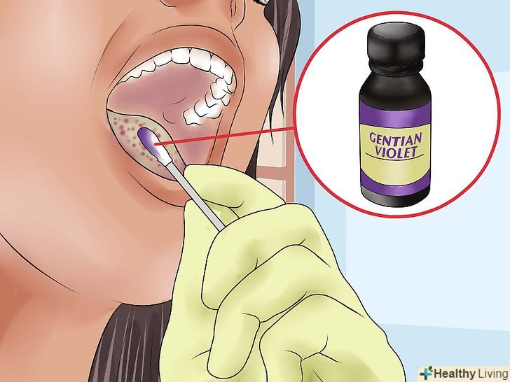 Використовуйте генціанвіолет.це ефективний засіб при молочниці слизової порожнини рота. Це протигрибковий барвник фіолетового кольору. Придбати цей засіб ви можете і без рецепта лікаря. Нанесіть невелику кількість генціанвіолету на ватний тампон і обробіть уражені ділянки слизової рота. Як правило, достатньо одного разу, щоб отримати позитивний результат. Оскільки генціанвіолет-це барвник, будьте обережні, щоб не капнути на одяг або інші предмети; надягайте рукавички при використанні цього засобу і не торкайтеся до губ, так як шкіра може забарвитися в фіолетовий колір.- Перед використанням даного засобу проконсультуйтеся з лікарем, так як недавні дослідження показали, що генціанвіолет може провокувати появу виразок у роті і бути пов'язаним з ротоглотковим раком.[17]