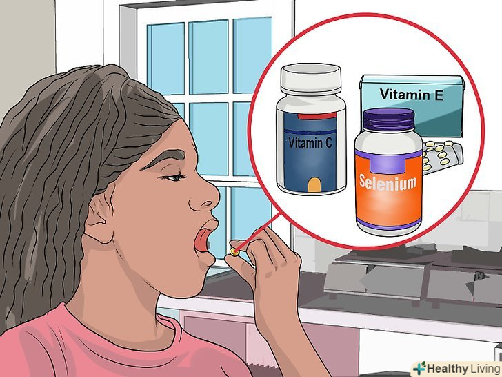 Приймайте вітаміни і мінерали.вітамін С, а також інші вітаміни і мінерали зміцнюють імунну систему і допомагають боротися з інфекцією і запаленням. Дотримуйтеся наступних доз: [18]- Вітамін С - від 500 до 1000 мг на добу;