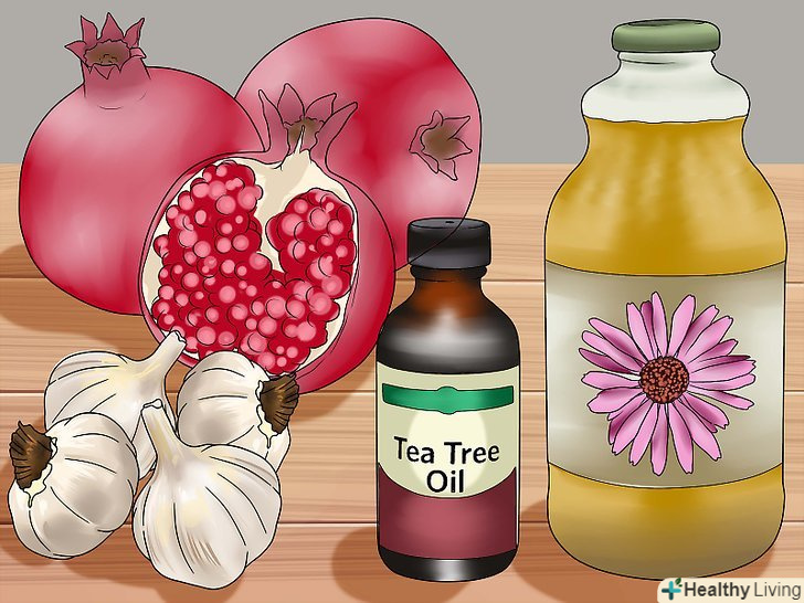 Використовуйте рослинні засоби.якщо ви вирішили використовувати трави для лікування стоматиту, обов'язково проконсультуйтеся з лікарем перед початком лікування. Дізнайтеся про можливу взаємодію трав з лікарськими препаратами. Хоча рослинні добавки можуть поліпшити ваш стан, в той же час вони можуть завдати серйозної шкоди вашому здоров'ю. При лікуванні стоматиту ви можете використовувати наступні добавки:- Часник. Часник має протигрибкові властивості. Добова доза-один зубчик часнику (або еквівалентна доза аллицина — 4000–5000мкг). Однак часник при взаємодії з лікарськими препаратами може збільшувати ризик кровотеч, особливо якщо ви приймаєте ліки, що розріджують кров, наприклад, клопідогрел, варфарин або аспірин. Також часник може взаємодіяти з препаратами, які використовуються для лікування ВІЛ.[22]