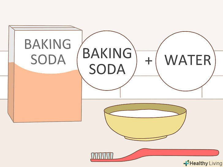 Приготуйте натуральну відбілюючу пасту з харчової соди.візьміть дві чайні ложки (10 г) харчової соди і додайте в неї стільки води, щоб вийшла паста. Занурте звичайну зубну щітку в пасту і круговими рухами почистіть нею зуби, не забуваючи приділити увагу внутрішній стороні зубів.- Коли будете чистити зуби, занурюйте щітку в пасту по кілька разів.