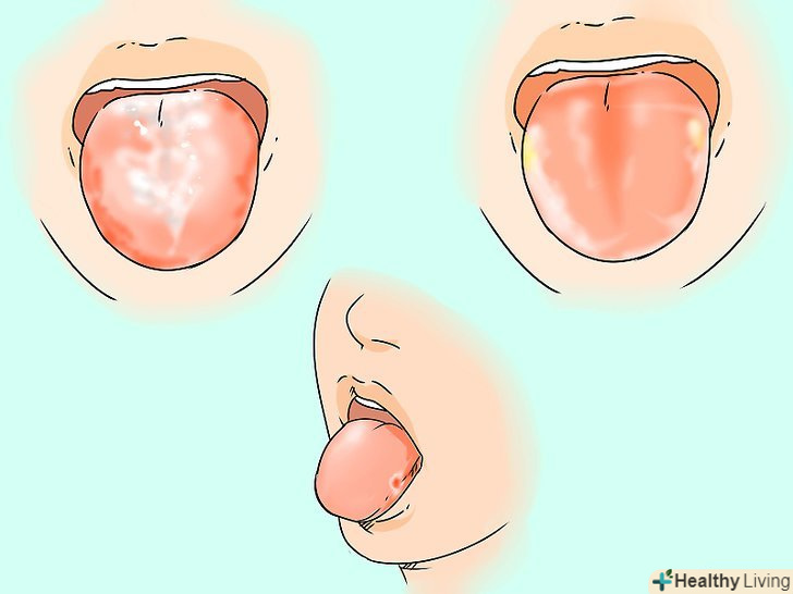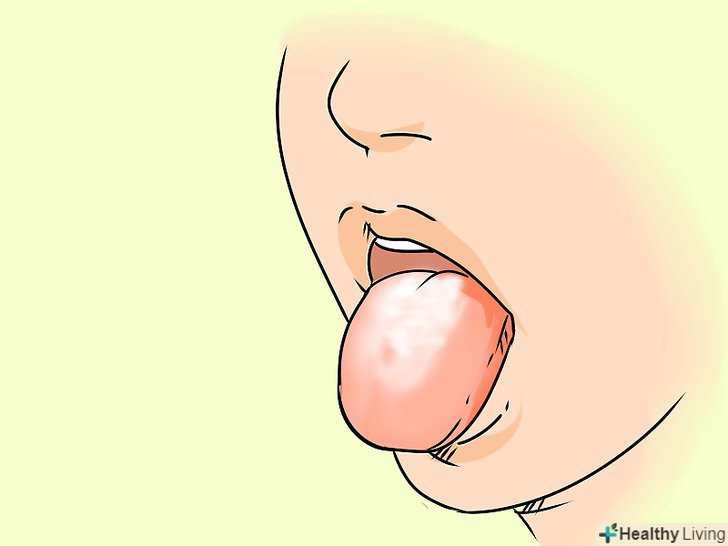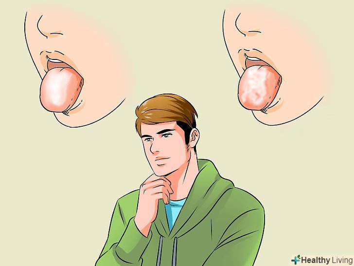 Слідкуйте за ознаками стоматиту.стоматит - це грибкова інфекція, яка часто буває причиною білого нальоту на мові. Стоматит часто розвивається після прийому антибіотиків.[4]- Ви також можете відчувати печіння на мові, а шкіра в куточках рота може потріскатися, ставши причиною хворобливих відчуттів.