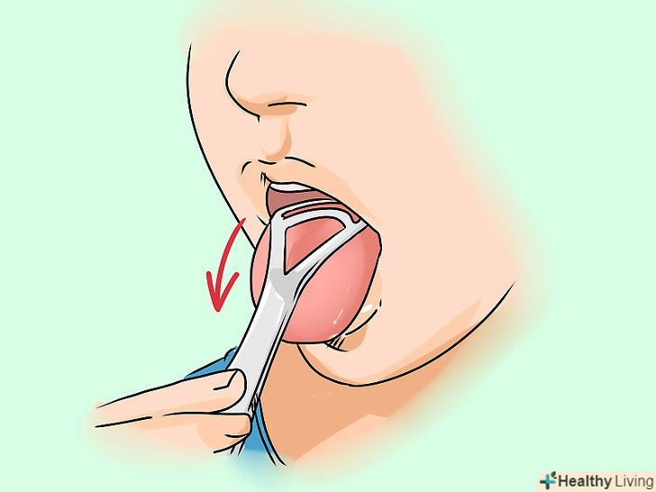 Акуратно почистіть язик за допомогою скребка для язика.на деяких зубних щітках є спеціальні скребки на зворотному боці ручки.- Ретельно, але акуратно проведіть скребком по язику взад і вперед (зсередини назовні). Не засовуйте скребок занадто далеко, щоб не викликати блювотний рефлекс.