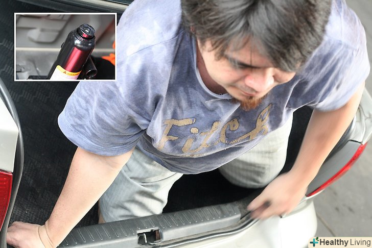 Використовуйте автомобільний домкрат для підняття кришки багажника.у деяких автомобілях можна знайти домкрат і парочку інструментів в багажнику разом з запаскою. Іноді вони складені під килимком або збоку. Якщо ви зможете дістатися до домкрата, встановіть його, проверніть під кришкою багажника і намагайтеся піднімати до тих пір, поки кришка багажника не відкриється.- Якщо ці методи не спрацьовують, Бийте по кришці і створюйте шум, щоб привернути увагу — якщо мова не йде про викрадення. якщо ви примудрилися потрапити в багажник, але у вас немає причин турбуватися про зайвий шум, який міг би привернути увагу викрадача, просто колотите по кришці багажника якомога сильніше і кричіть до тих пір, поки хто-небудь не почує вас і не приведе допомогу. Якщо ви перебуваєте в досить людному місці, ви можете спробувати цей метод, поки шукаєте засувку багажника, Але знайте, що крик і стукіт можуть привести вас до стану істерики і гіпервентиляції.