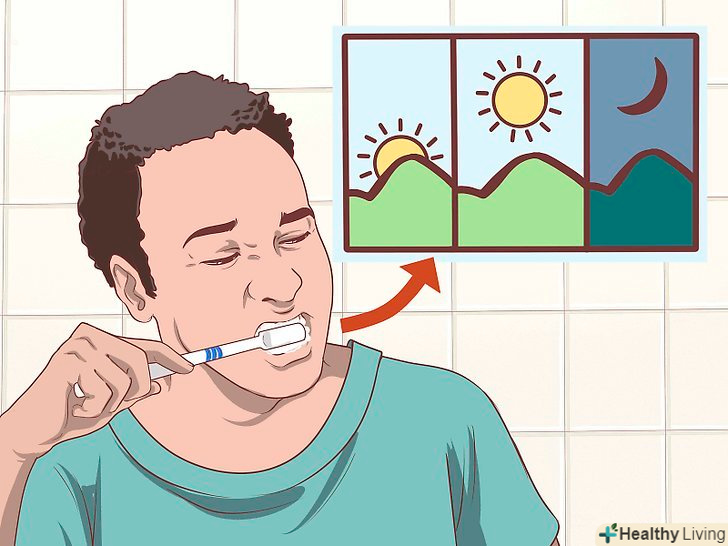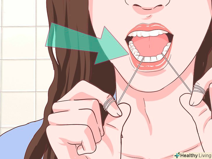 Чистіть зуби зубною ниткою хоча б один раз в день.відріжте шматочок зубної нитки довжиною близько 50 сантиметрів. Намотайте нитку на середні пальці так, щоб між ними залишилося 3-5 сантиметрів. Протягніть нитку між двома зубами і кілька разів проведіть нею вгору-вниз і вперед-назад. Врахуйте, що зубний наліт і їжа можуть застрягти під лінією ясен, звідки їх можна видалити за допомогою нитки. Обертайте нитку навколо кожного зуба і простягайте її до ясен якнайдалі, щоб це не викликало дискомфорт. Виконайте те ж саме з наступним зубом, при цьому перейдіть на нову ділянку нитки, так як вона забруднюється і стирається. Протягнута між двома зубами нитка повинна допомогти очистити обидві поверхні сусідніх зубів. Після того як ви трохи попрактикуєтеся, весь процес буде займати 2-3 хвилини в день.[9]- Якщо ви не впевнені, чи правильно чистите зуби ниткою, проконсультуйтеся зі своїм стоматологом при наступному відвідуванні.