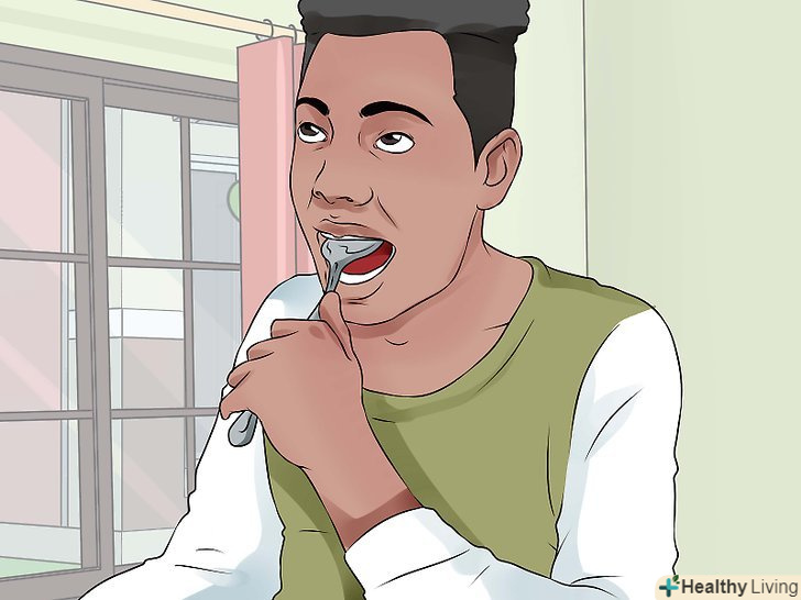 Зіскобліть ложкою слину з мови.візьміть ложку і спробуйте зняти слину з задньої частини язика. Повільно перемістіть слину в передню частину порожнини рота. Розгляньте слину, що залишилася на ложці. Якщо вона прозора, то навряд чи у вас неприємний запах з рота. Якщо слина молочно-білого або навіть жовтуватого кольору, швидше за все, ваше дихання не відрізняється свіжістю. Наліт, який ви зняли з мови, складається з бактерій, які є причиною неприємного запаху.[13]- Дуже важливо очищати задню частину язика, коли ви чистите зуби. Завдяки цьому ви зможете прибрати більшу частину бактерій, які викликають неприємний запах з рота.