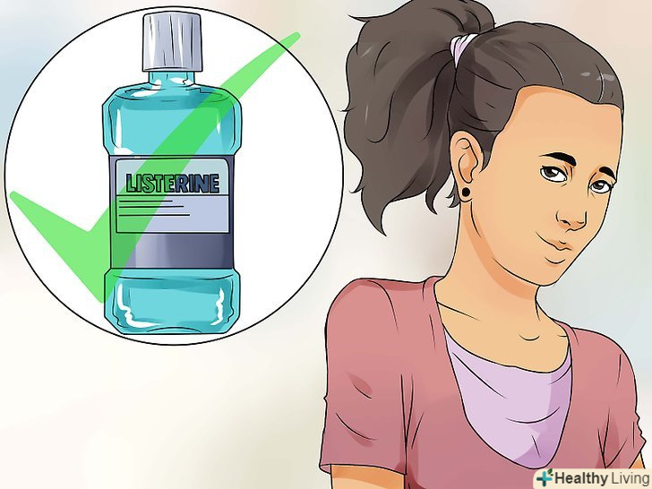 Використовуйте ополіскувач для порожнини рота, наприклад, лістерин.лістерин випускається в маленьких пляшечках. Тому Ви можете носити його з собою. Прополощіть рот протягом 20 секунд і виплюньте. Завдяки цьому ви зможете видалити бактерії, які викликають неприємний запах з рота. Крім того, свіжий подих вам буде забезпечено. Вибирайте ополіскувач для порожнини рота проти патології ясен або гінгівіту. Крім того, ополіскувач повинен запобігати утворенню зубного нальоту.[3]- Лістерин також випускає смужки, які розчиняються на мові. Вони призначені для швидкої боротьби з неприємним запахом з рота. Це досить ефективний засіб.