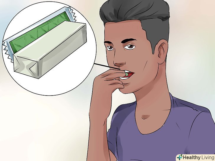 Жуйте жувальну гумку без цукру.Жувальна гумка без цукру допомагає стимулювати вироблення слини. Жувальна гумка допомагає боротися з сухістю в роті. Сухість у роті часто призводить до появи неприємного запаху. Пов'язано це з тим, що бактерії, що знаходяться в ротовій порожнині, не вимиваються, а накопичуються в ній. Жувальна гумка також допомагає видалити залишки їжі з проміжків зубів. Однак не варто нехтувати належним доглядом за порожниною рота. Чистіть зуби, використовуючи зубну щітку і зубну нитку.[4]- Можна також використовувати натуральні жуйки, виготовлені з м'яти та інших трав, які допомагають замаскувати неприємний запах з рота. Крім того, вони ефективно видаляють залишки їжі.[5]