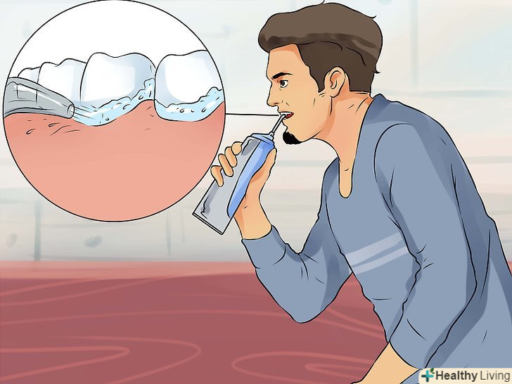Використовуйте іригатор для порожнини рота.цей пристрій часто використовується замість зубної нитки. Іригатор порожнини рота - це апарат, що формує тонкий струмінь води, яка під тиском промиває міжзубні проміжки від харчових залишків. Ви також можете використовувати його для очищення мови. Просто зайдіть в вбиральню, наповніть апарат водою і промийте ротову порожнину. Якщо у вас є ополіскувач для рота, ви можете додати його в воду. Завдяки цьому ви зможете позбутися неприємного запаху.[9]