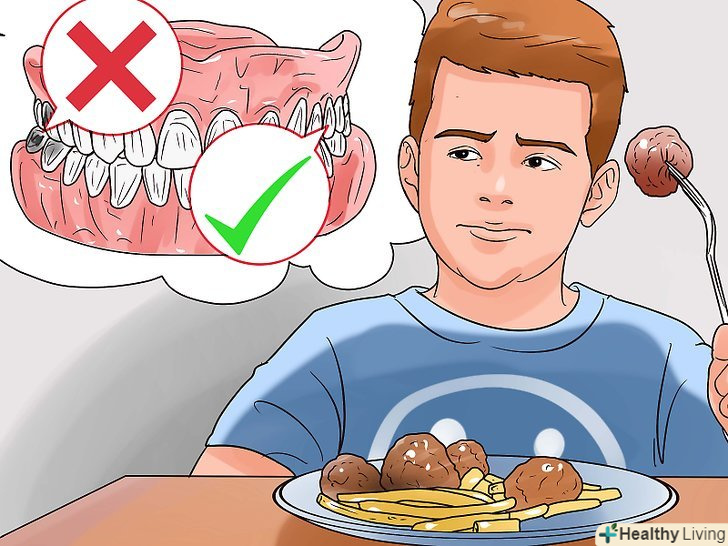 Намагайтеся перший час віддавати перевагу більш м'якій їжі.це особливо важливо в перші 24 години після видалення зуба мудрості. Потім, коли лунка почне поступово гоїтися і затягуватися, можна поступово переходити з м'якої їжі на більш жорстку. Але в цілому краще уникати жорсткої, що тягнеться, хрусткою і гострої їжі, тому що є ризик того, що залишки такої їжі потраплять в лунку, викликавши подразнення слизової оболонки або навіть інфекційний процес.[13]- Жуйте на стороні, протилежній лунці видаленого зуба.