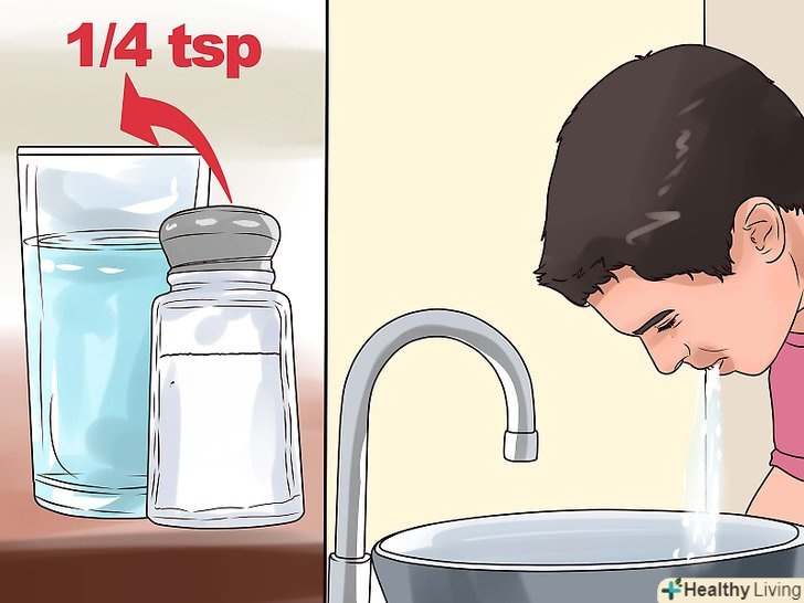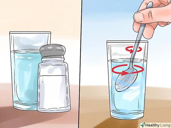 У перші 48 годин потрібно акуратно полоскати порожнину рота сольовим розчином.у перший день порожнину рота дійсно потрібно полоскати, але дуже обережно.[4]- Змішайте 1/4 чайної ложки солі і склянку теплої води. Гарненько перемішайте розчин.