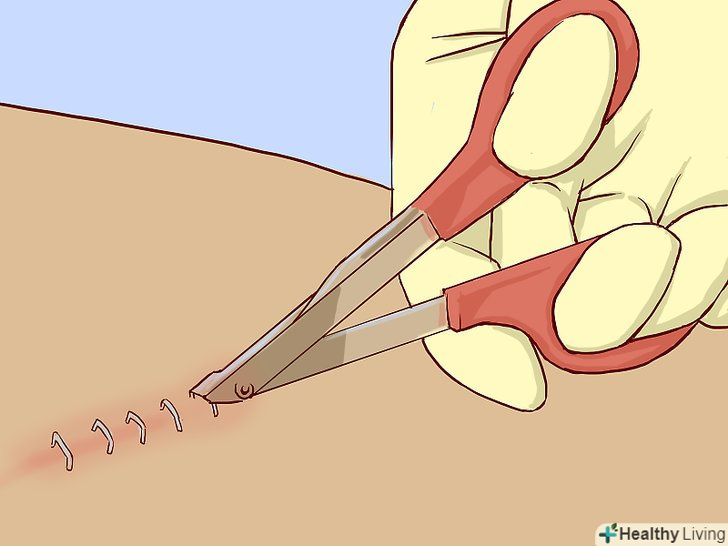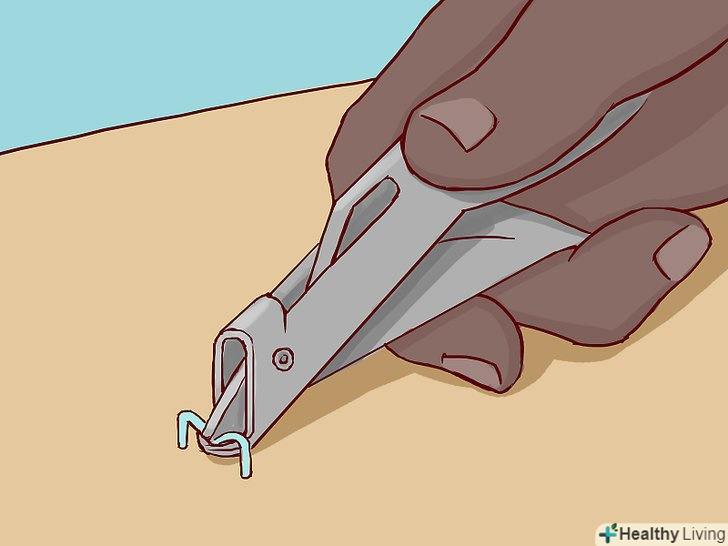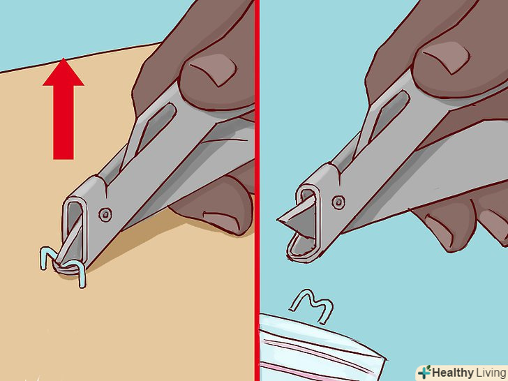 Вставте нижню частину скобера під середину скоби.почніть з того Краю, де розріз вже затягнувся. [3]- Цей спеціальний інструмент лікарі використовують для видалення хірургічних скоб.
