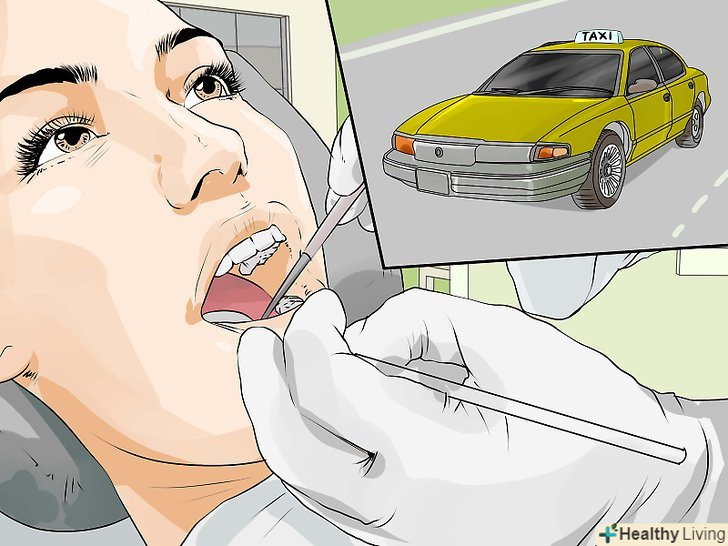 Пошукайте варіанти загального наркозу.якщо ви не можете впоратися зі страхом, можливо, вам підійде загальний наркоз. Загальний наркоз пов'язаний з певними ризиками, і в більшості країн він не використовується в стоматології. Проте, можливо, будь-які з стоматологічних центрів у Вашому місті вдаються до загального наркозу.[20]- Попросіть друга відвезти вас додому і викличте таксі. Вести машину після пробудження від наркозу небезпечно.[21]