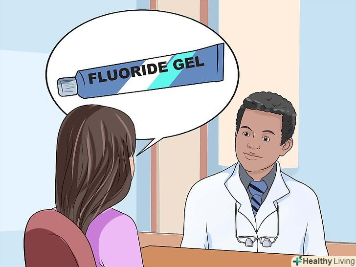 Попросіть лікаря провести процедуру фторування зубів.найефективніше лікування фтором-це нанесення спеціального складу стоматологом. Склад може наноситися на зуби як покриття, але можна також тримати склад на зубах в каппі.[16] лікар може виписати вам гель з фтором для домашнього застосування. Фтор захистить зуби від подальшого витончення емалі, карієсу і буде корисний для здоров'я зубів.[17]- Фтор зміцнить емаль і продовжить термін служби пломб та інших штучних елементів.[18]