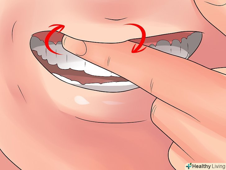 Масажуйте ясна, щоб звільнити застряглу їжу.ви можете помасажувати свої власні ясна за допомогою пальців, для того щоб позбутися від шматочків їжі, що залишилася.- Натисніть своїм вказівним пальцем на ясна і використовуйте кругові рухи для стимуляції ясен.