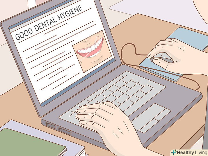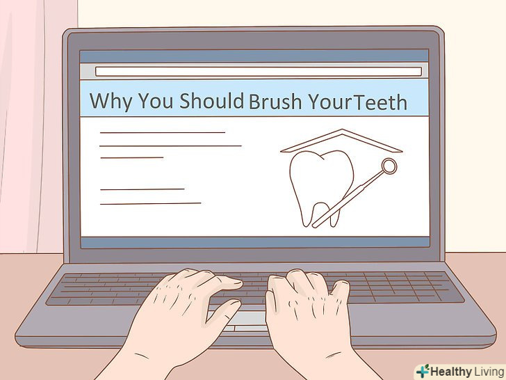 Поговоріть зі стоматологом.Стоматологи знають і бачать все, що стосується ваших зубів. Якщо вам складно повірити в важливість догляду за зубами, то обговоріть це з лікарем. Він поділиться з вами своїми великими знаннями і досвідом.[14]- Також стоматологи можуть поділитися з вами плакатами або брошурами. Вони будуть служити вам нагадуваннями про важливість догляду за зубами.