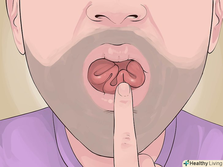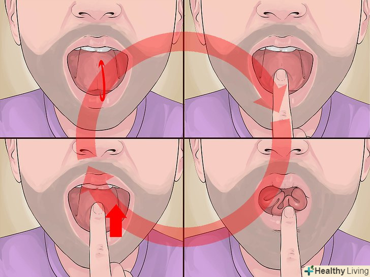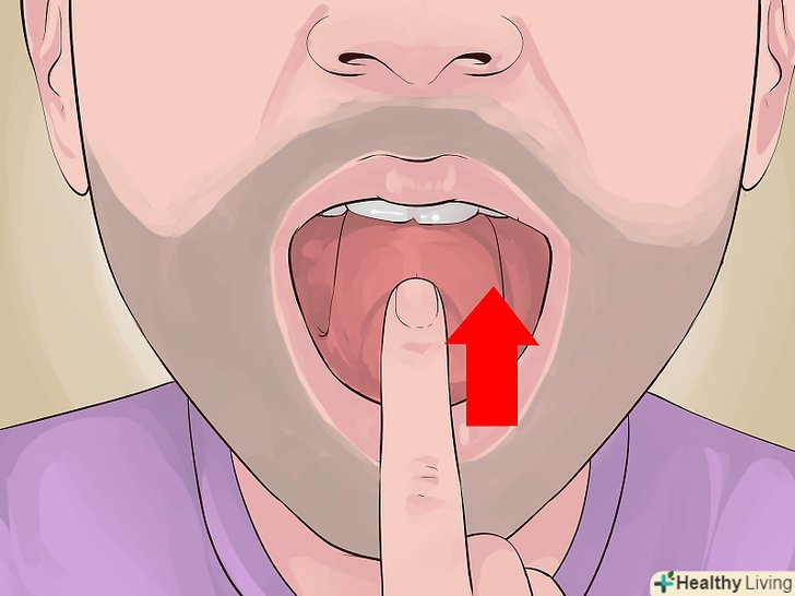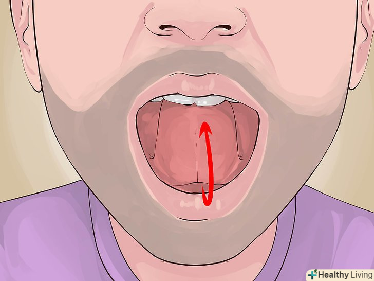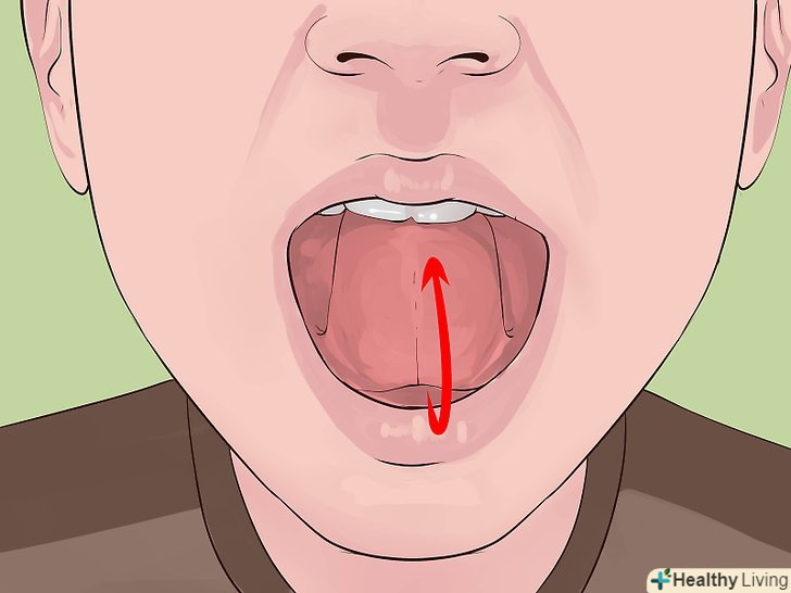 Притисніть кінчик язика до основи двох передніх верхніх зубів.мета полягає в тому, щоб навчитися рухати кінчиком язика незалежно від його бічних країв і середини. Спочатку спробуйте доторкнутися кінчиком язика до основи передніх верхніх зубів. При цьому продовжуйте тримати краю язика загнутими догори. Для збереження форми мови вам, можливо, доведеться притиснути його краю до верхнього неба.- Доторкніться самим кінчиком язика до основи верхніх передніх зубів. Якщо передніх або інших зубів стосується ще якась частина мови, трохи відтягніть його назад. При цьому продовжуйте притискати кінчик язика до передніх зубів. Ця вправа допоможе вам розрізняти м'язи своєї мови (передні середні і бічні м'язи).