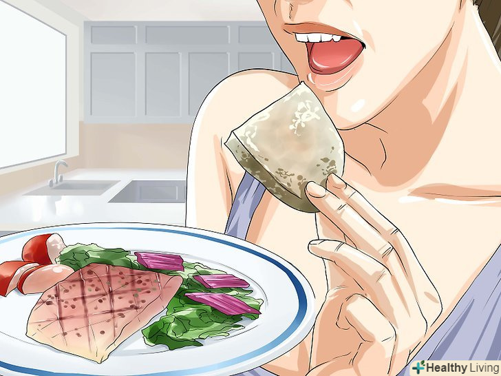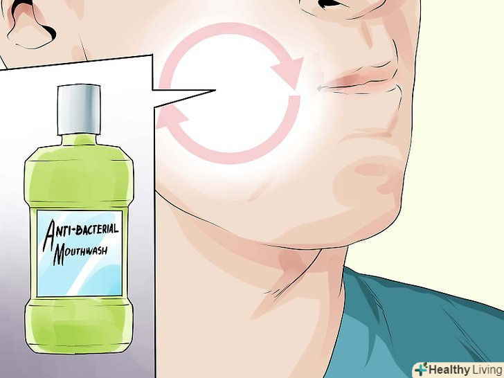 Полощіть рот після прийому їжі.хоча стоматологи і рекомендують чистити зуби всього лише два рази на день, ви можете полоскати рот після кожного прийому їжі, що дозволить запобігти скупченню шкідливих кислот і бактерій.[5]- Користуйтеся антибактеріальною рідиною для полоскання рота. Це допоможе вам зміцнити зуби і ясна. Якщо рідина для полоскання рота дратує зуби або ясна, або після полоскання ви відчуваєте біль, зверніться до стоматолога, який порекомендує вам інший засіб.