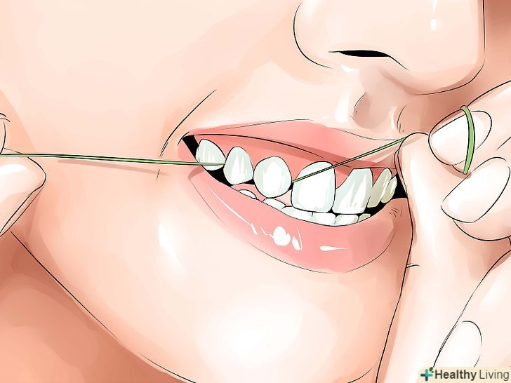 Регулярно користуйтеся зубною ниткою.Чистка зубів ниткою є важливою складовою правильної гігієни порожнини рота. За допомогою нитки ви зможете очистити ділянки, недоступні для зубної щітки. Це допомагає запобігти утворенню зубного нальоту і скупчення бактерій у важкодоступних місцях. Стоматологи рекомендують користуватися зубною ниткою хоча б раз в день.[2]- Вам знадобиться нитка довжиною близько 46 сантиметрів. Оберніть кінці нитки навколо своїх середніх пальців і, утримуючи її таким чином, пройдіться нею по всіх проміжках між зубами.