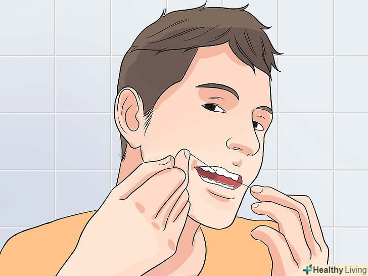 Регулярно чистіть зуби ниткою.навіть якщо ви справно чистите зуби щіткою, існують ділянки, до яких неможливо дістатися з її допомогою. Щодня чистіть зуби ниткою, щоб видалити застряглі між ними залишки їжі. Як і при чищенні щіткою, слід дотримуватися правильну техніку, інакше можна подряпати зуби або ясна. Оберніть нитку навколо вказівних пальців обох рук, так щоб між ними залишився вільний відрізок нитки довжиною близько 5 сантиметрів.- Притискайте нитку до зуба, щоб видалити з нього наліт і при цьому не терти ясна.[5] акуратно рухайте ниткою вперед і назад. Не прикладайте великих зусиль, щоб не пошкодити ниткою ясна.