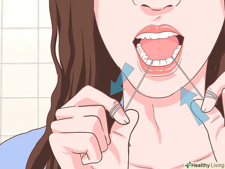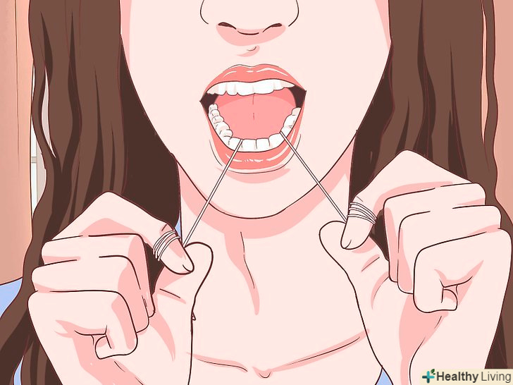 Щодня чистіть зуби ниткою. не забувайте кожен день користуватися зубною ниткою. Витягайте близько 45 сантиметрів нитки і обмотуйте кінці відрізка навколо середніх пальців. Міцно затискайте нитку між великими і вказівними пальцями.[32]- Акуратно пройдіться ниткою між усіма зубами. Рухайте при цьому ниткою вперед і назад, а також загинайте її навколо основи кожного зуба.