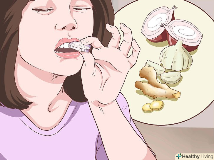 Спробуйте цибулю, часник або імбир.часник, імбир і цибуля мають протизапальні властивості і допомагають знизити запалення ясен.[26][27][28] крім того, ці продукти знімають біль. Прикладайте скибочки або пасту з них, щоб полегшити біль.- Відріжте скибочку цибулі або часнику і покладіть його на зуб прямо над хворою яснами. Обережно прикусіть скибочку, щоб з нього виділився сік. Після цього можна пожувати м'ятну жувальну гумку або почистити зуби, щоб усунути запах.[29]