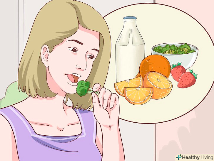 Вживайте достатню кількість вітаміну C і кальцію.переконайтеся в тому, що вам вистачає вітаміну C і кальцію. Нестача вітаміну C може призвести до набряку і кровоточивості ясен і навіть до втрати зубів.[36]- Велика кількість вітаміну C міститься в цитрусових і їх соках, наприклад апельсинах і грейпфрутах, а також в ківі, солодкому перці, папайї, полуниці, брокколі і мускусної дині.